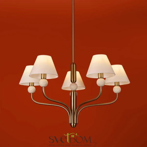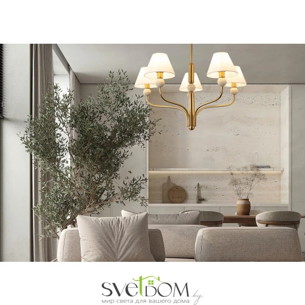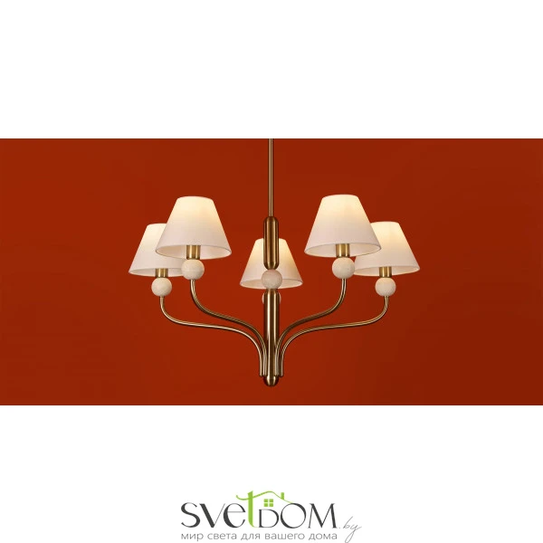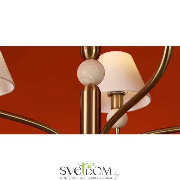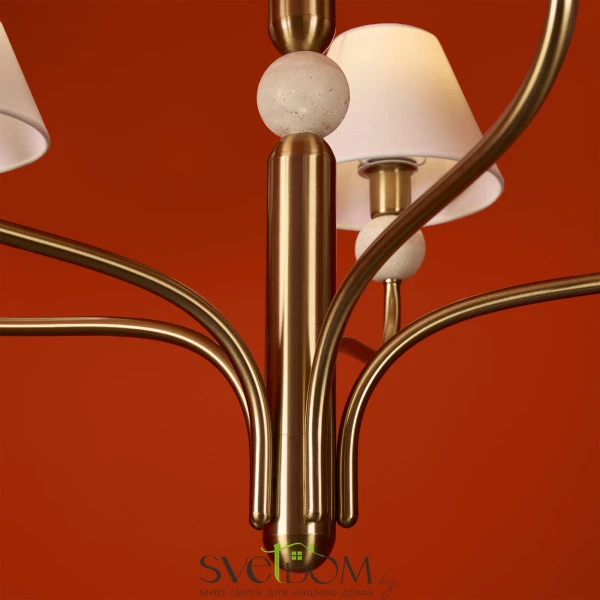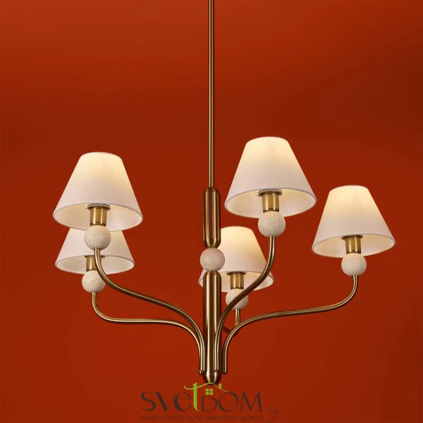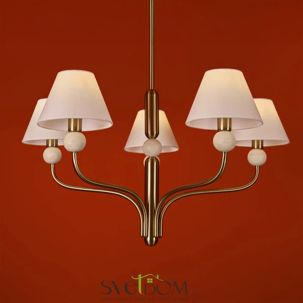 Арматура - металл в цвете латунь. Тканевые абажуры, травертиновые элементы. Лампы E14 (в комплекте). Серия  состоит из люстры c 5 плафонами и  бра. Трендовое сочетание в классическом стиле.