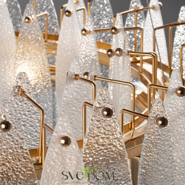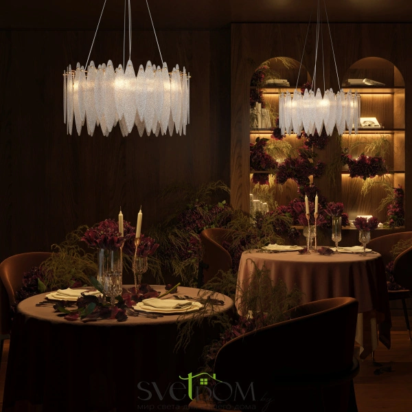 Lucrecia – серия с выразительным характером и романтичным настроением. визуально легкий силуэт составляют несколько рядов стеклянных подвесок, обрамляющих металлическую окружность. обтекаемые контуры лепестков и живописная фактура «замороженного» стекла – тренд светодизайна. металлические элементы, окрашенные в цвет французского золота, подчеркивают праздничное настроение модели. расположенные вдоль окружности источники света обеспечивают равномерное распределение светового потока. отражаясь и преломляясь в декоре, он образует красочную игру бликов и переливов. длина тросов регулируется, что позволяет адаптировать подвесные светильники под любую высоту потолков. серия включает бра и люстры на 5 и 8 ламп. с помощью такого светового ансамбля легко организовать комплексное освещение гостиной, спальни или столовой. воздушный невесомый дизайн интегрируется в современные и классические стили – от фьюжн и шебби-шика до ар-деко. материал арматуры – металл. цвет – французское золото. декоративные элементы из металла и