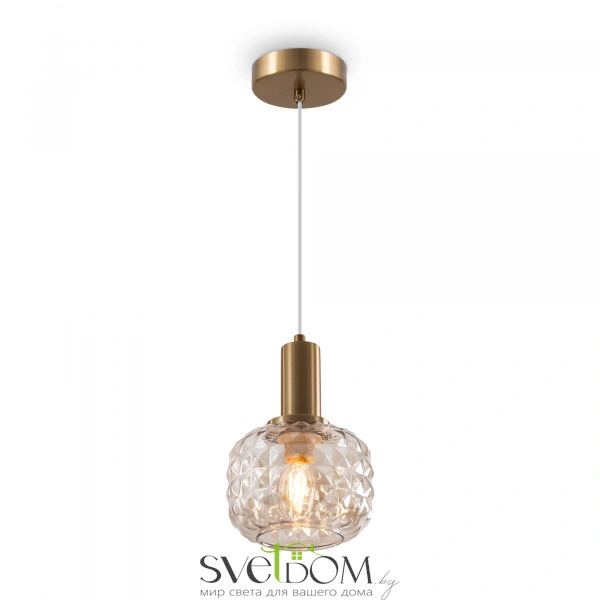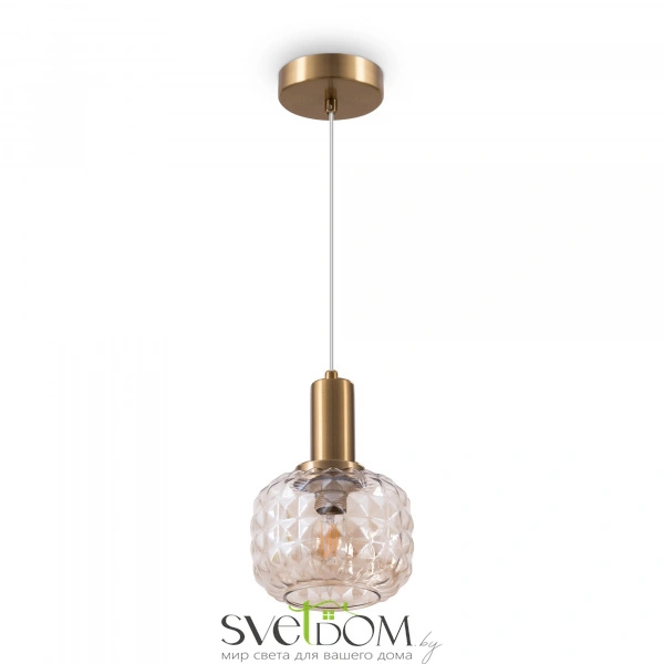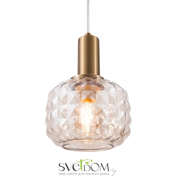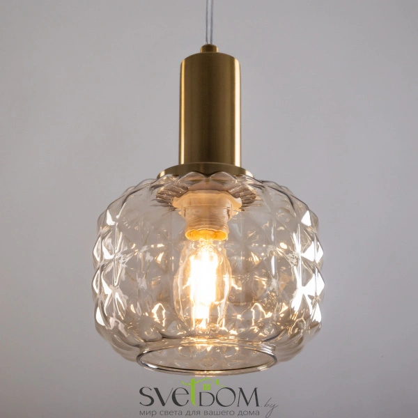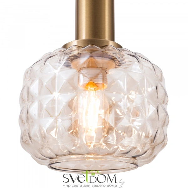 Металлическая арматура в цвете латунь. Плафоны из толстого рельефного стекла в оттенке амбра с «шипованной» огранкой. Подвесные модели регулируется по высоте. Источник света - лампа с цоколем Е14