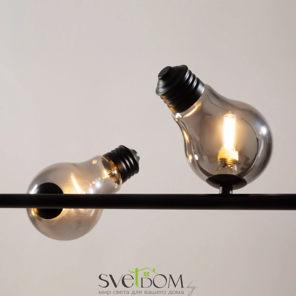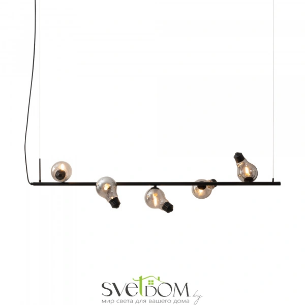 Металлическая арматура, цвета — чёрный и латунь. Прозрачные плафоны-лампочки из стекла в тон арматуры хаотично “разбросаны” по острову светильника. Подвесы регулируются по высоте. Источник света — лампа с цоколем G9.