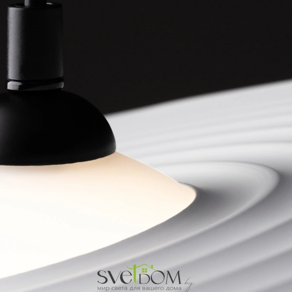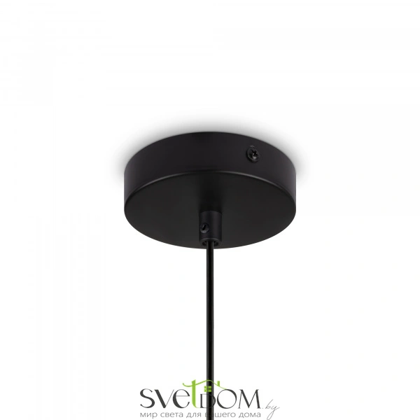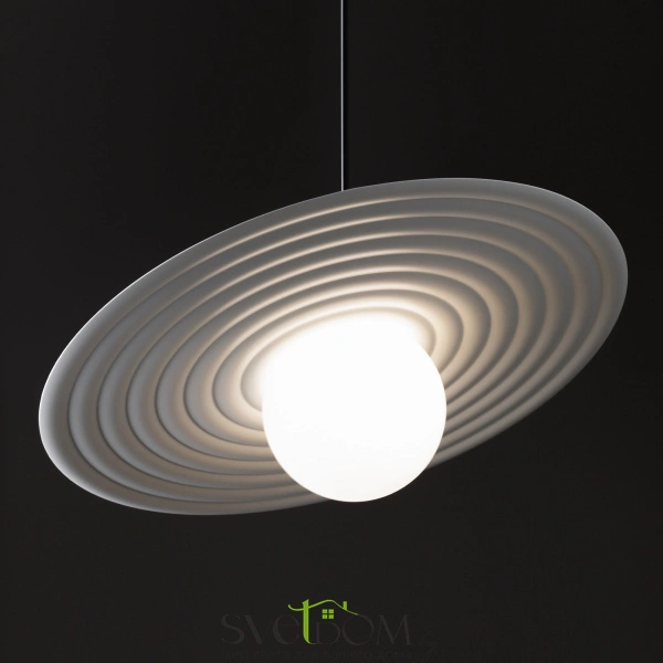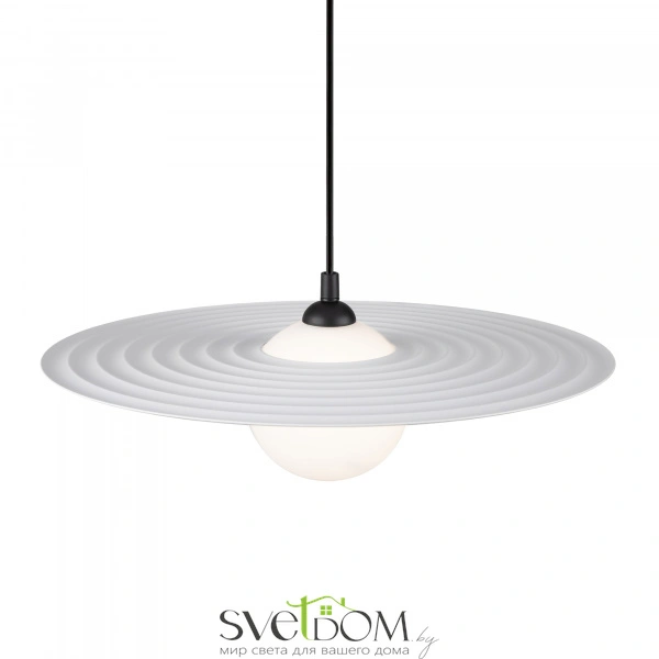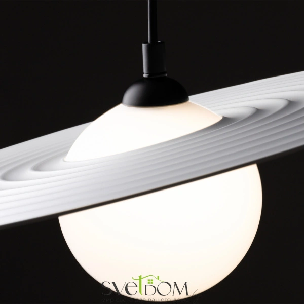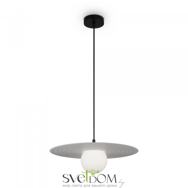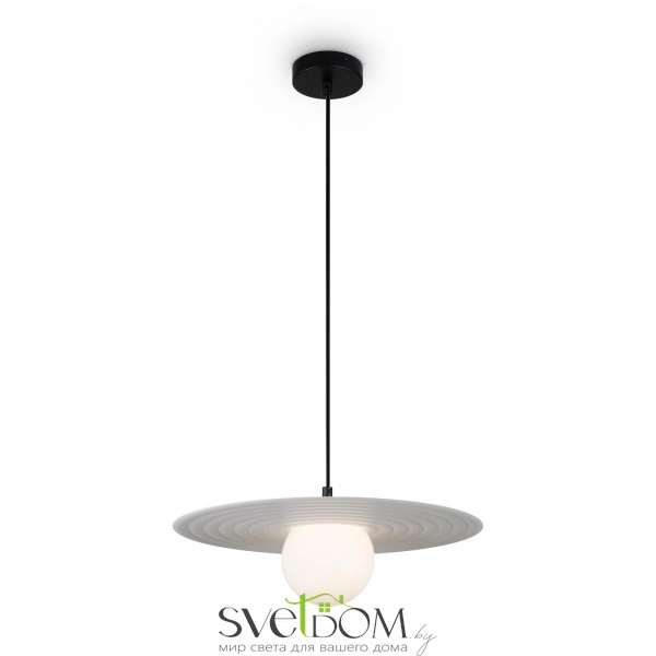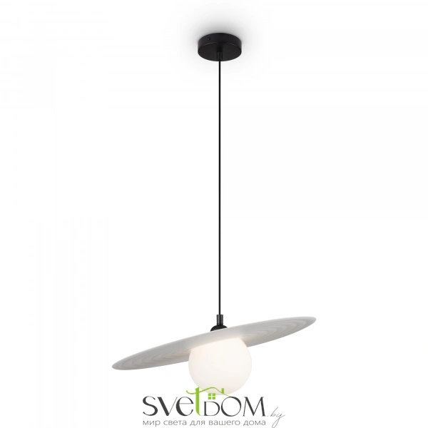 Арматура — металл, цвета — чёрный и белый. Матовый белый плафон с декоративным элементом — металлической тарелкой. Можно регулировать минимальную и максимальную высоту. Лампа с цоколем G9 служит источником света.