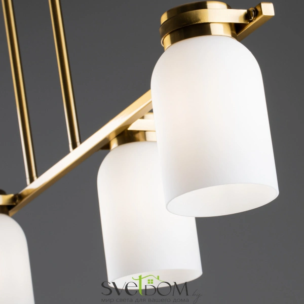 Арматура из металла. цвет латунь. плафоны из белого стекла новой необычной формы. два варианта светильников — потолочные и бра. подходит для помещений с низкими потолками. источник света — лампа. цоколь e14.