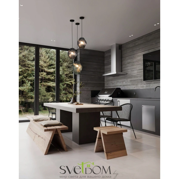 Материал арматуры металл черного цвета и плафоны, выполненные из стекла. Подвесные светильники в двух размерах и разных цветовых решения: дымчатый, зеленый, янтарный и темно-сине-зеленый. Светильники с цоколем E27. Рельефное стекло флористической формы создают выразительную игру бликов в пространстве и преломляя свет, наполняют интерьер переливами цвета. Рекомендовано использование в одном интерьере несколько размеров и цветов.