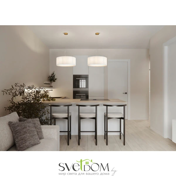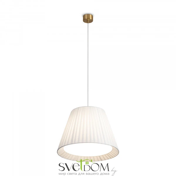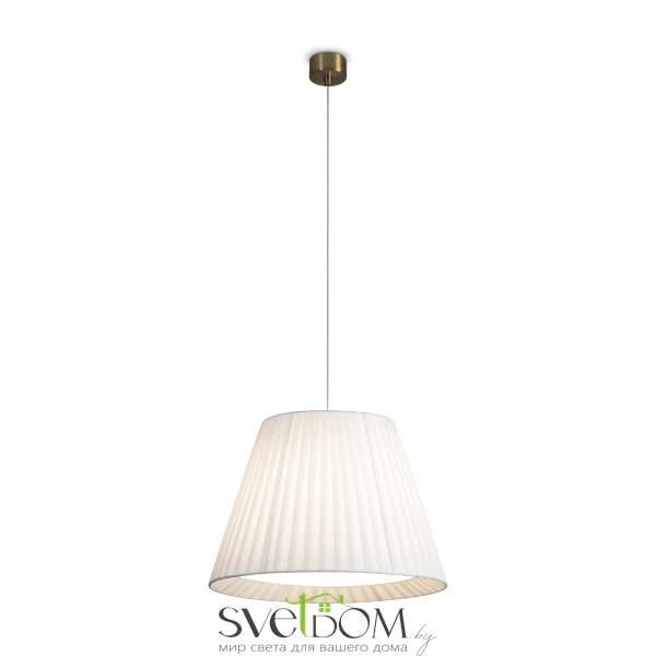 Металлическая арматура в цвете латунь. Подвесные светильники 2-х форм с плессированными абажурами, дополненные рассеивателем. Лампы E27/E14 (не в комплекте) дают мягкий рассеянный свет.