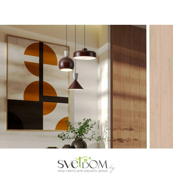 Материал арматуры — металл, цвет абажура —глубокий бордовый и нежно кремовый. Три уникальные формы плафонов с цоколем E27/E14 (лампы в комплекте). Минималистичный дизайн с динамикой света.