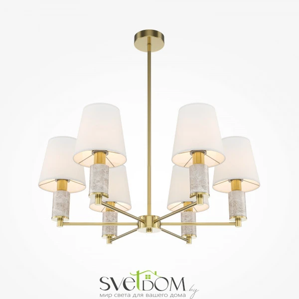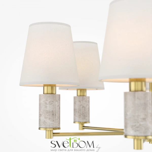 Серия включает подвесные (6 и 8 рожков), настенные, настольные и напольные светильники. Арматура: металл цвета сатинированной латуни с декоративными элементами из серого мрамора. Абажуры: текстиль. Сменный источник света с цоколем E14. Высота подвесных светильников регулируются сегментами штанги. Классический дизайн в современном исполнении. Предназначены для основного и акцентного освещения жилых помещений. Универсальное применение: гостиные, столовые, спальни, кабинеты, прихожие.