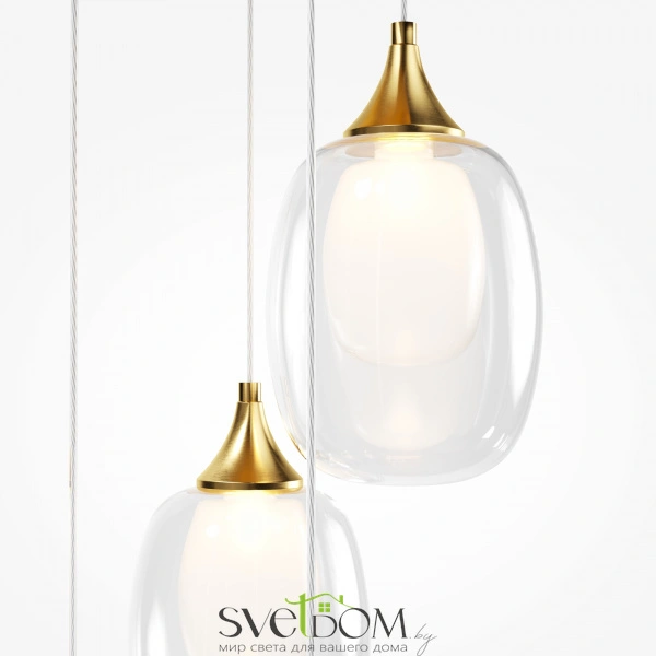 Металлическая арматура, цвет — латунь. Плафоны — двойное выдувное стекло. Внутренняя часть – матовая, внешняя – прозрачная. Элегантная неоклассика, трендовые округлые формы. Прозрачный провод длиной 3 метра подходит для помещений с высокими потолками. Регулируемая высота светильника для удобного размещения.