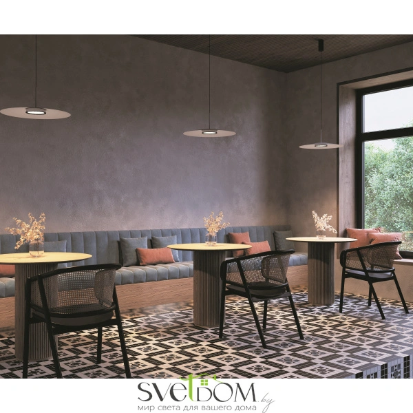 Металлический корпус, цветовая палитра - черный, белый, золото и терракотовый. Два  вида плафонов: «таблетка» с графичным рельефом из ассиметричных линий; «таблетка» + идеально-гладкая металлическая «тарелка». Дизайн вдохновлен супрематической эстетикой.  LED-источник света, цветовая температура - 3000К. Регулируемый провод - 3 метра.