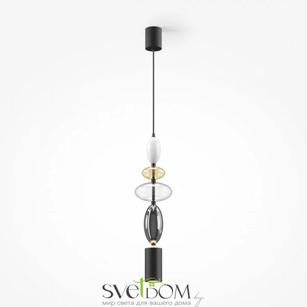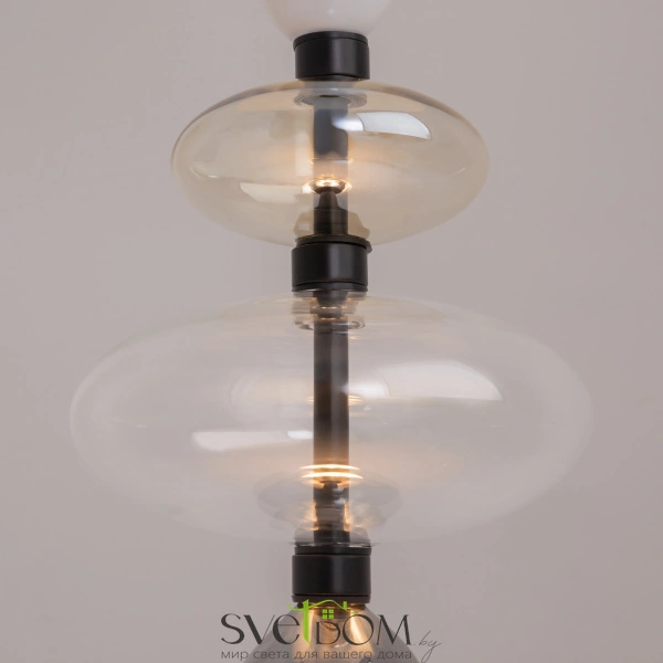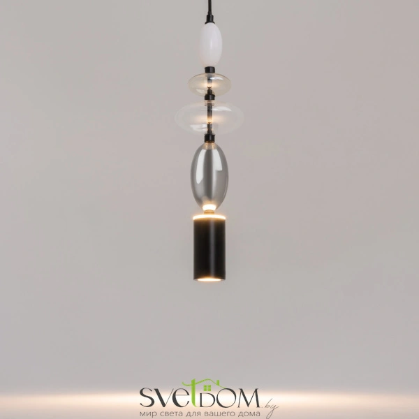 Черная металлическая арматура. плафоны из стекла коньячного, белого, дымчатого цвета и прозрачный. источник света комбинированный: нижний - съемная лампа с цоколем gu10, верхний -  встроенный led. цветовая температура светильников 2700к, угол рассеивания света 120 градусов. высота регулируется с помощью провода длиной 3 м.  монохромный дизайн, стеклянные элементы впишутся в различные стили интерьеров.