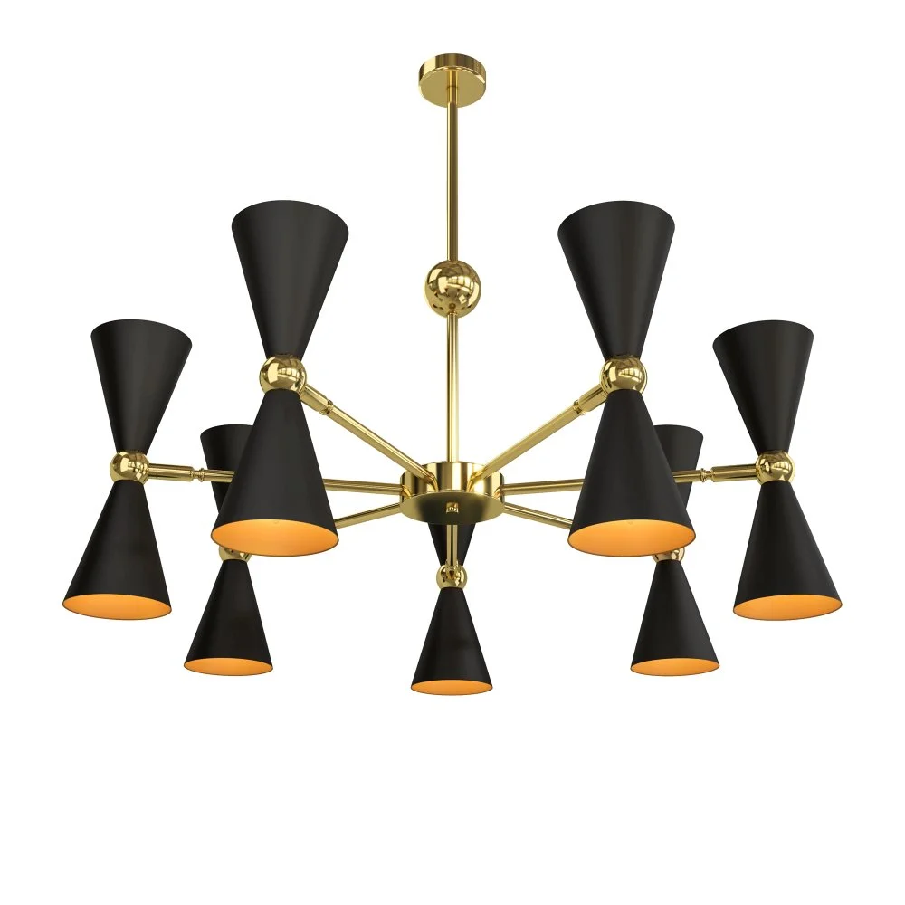 Материал арматуры - металл, оттенок – золото. Металлические плафоны изнутри окрашены в золотой цвет, снаружи в двух вариантах: черный и белый. Поворотный механизм, рожки вращаются. Источник света - лампа с цоколем Е14.
