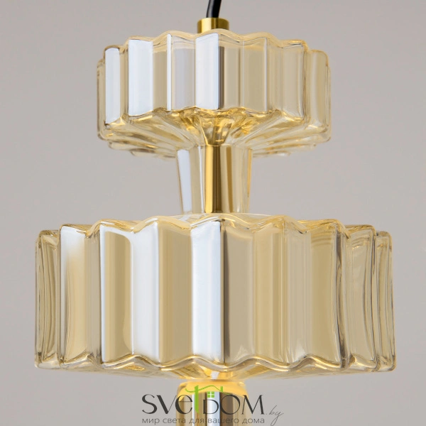 Арматура в цвете латуни. Плафоны и декоративные элементы стеклянные, цвет коньячный. Источник света: LED-светодиод. Цветовая температура — 3000К, угол рассеивания — 120 градусов. Регулируемый по длине провод 3 метра — для использования в помещениях с высокими потолками. 3 варианта дизайна плафонов для составления композиций из одинарных светильников. Магнитные потолочные чаши без креплений сбоку и  держателя провода.