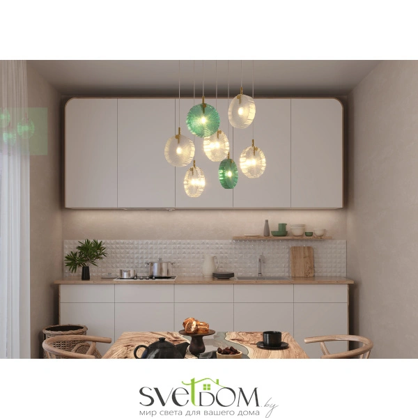 Материал арматуры - металл, цвет - латунь. Серия вдохновлена эстетикой северных лесов. Плафоны - литое цельное стекло в форме и фактуре среза дерева. Три варианта цвета плафонов: прозрачный;  прозрачный + матовый; прозрачный + матовый + изумрудный. Эстетичные крепления и магнитная  потолочная чаша без видимых болтов. Готовые композиции из 1, 5, 7 и 12 плафонов. Источник света -  лампа с цоколем G4.
