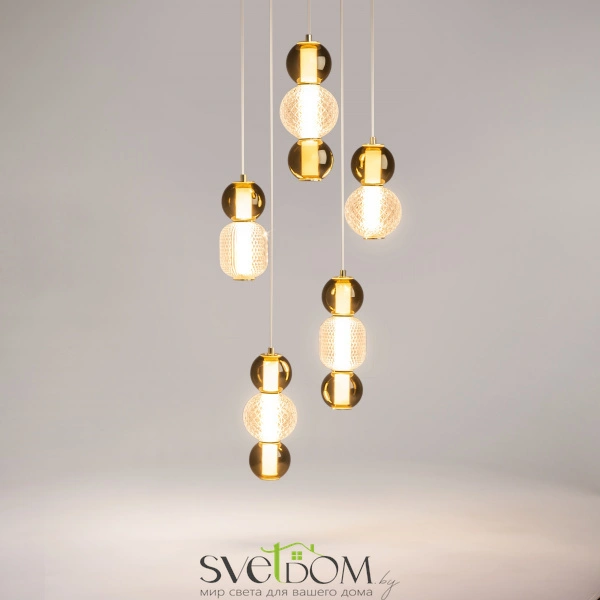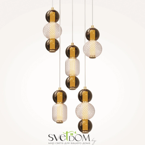 Материал арматуры - металл, цвета - золото, хром. микс плафонов: гладкие cферы коньячного или дымчатого оттенка + округлые рельефные с ромбовидным узором из прозрачного стекла. регулируемая высота подвесных моделей - максимальная длина провода 3 метра. led-источник света, цветовая температура 3000к