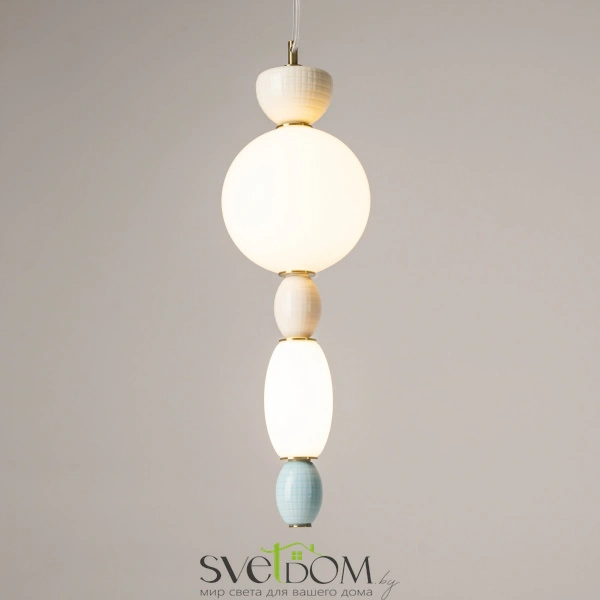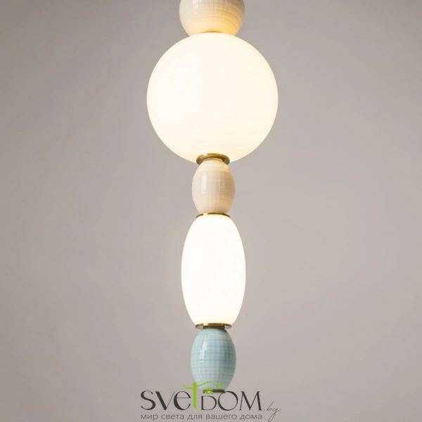 Металлическая арматура цвета латуни. Плафоны из белого стекла для мягкого, равномерного освещения, декоративные элементы из цветной керамики. Угол рассеивания 120°. Цветовая температура – 3000 К. Регулируемый провод длиной 3 м.