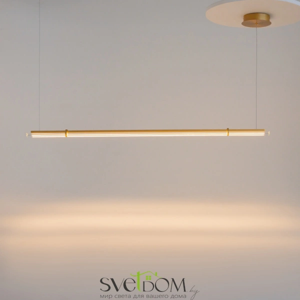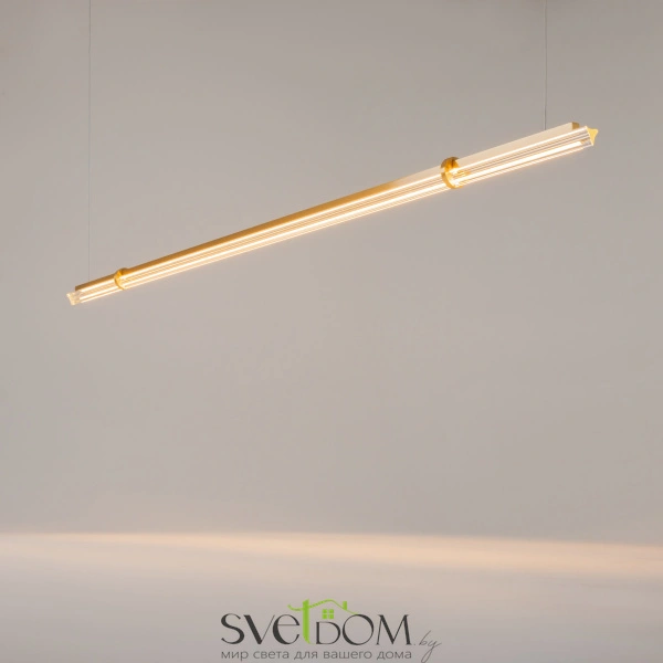 Металлическая арматура латунного цвета дополнена сатинированным финишным покрытием. Тонкие плафоны, изготовленные из рифленого стекла. Два варианта длины: 1200 и 1500 мм. Трехметровый провод можно регулировать для установки в помещениях с высокими потолками. Цветовая температура LED-источника света — 3000К, угол рассеивания — 120 градусов.