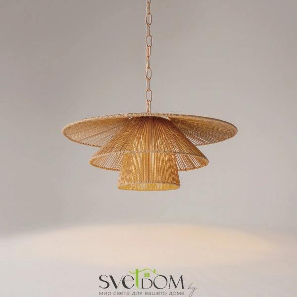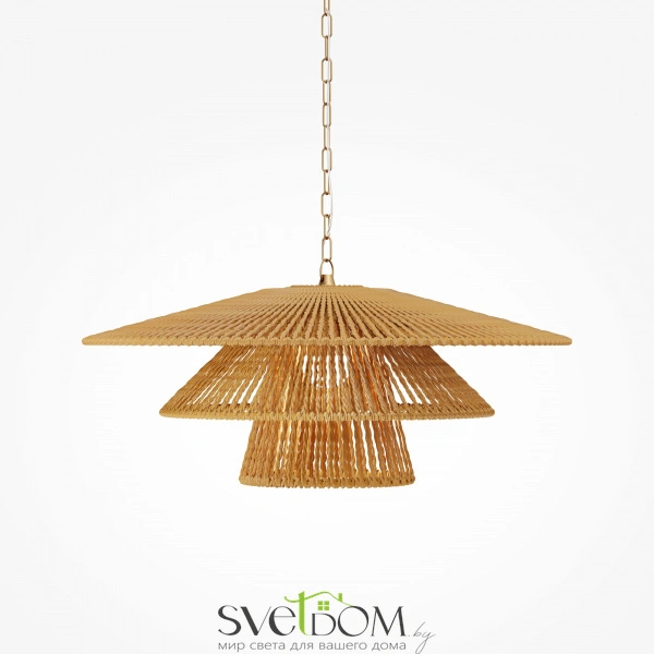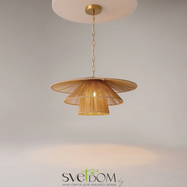 Материал абажура — натуральный ротанг. Металлическая арматура в цвете латуни. Две формы абажуров. Металлическая цепь в цвете латунь длиной 3 метра, подходит для помещений с высокими потолками. Эко-дизайн, вдохновленный дикими пляжами Индийского океана. Сменный источник света.