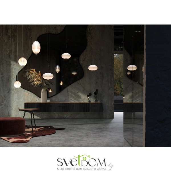 Подвесные светильники серии Bruma представлены в двух дизайнах: арматура глянцевый хром с белым стеклянным плафоном с нанесённым изнутри рельефом; черная арматура с антибликовым покрытием и черный плафон с наружным рельефом. Градиент на стекле от белого или черного к прозрачному. LED-источник света (3000K) имеет два направления: рассеянный и направленный.  Подвесные светильники Bruma дополнят большинство современных интерьеров как в качестве одиночного акцента, так и в композиции друг с другом.