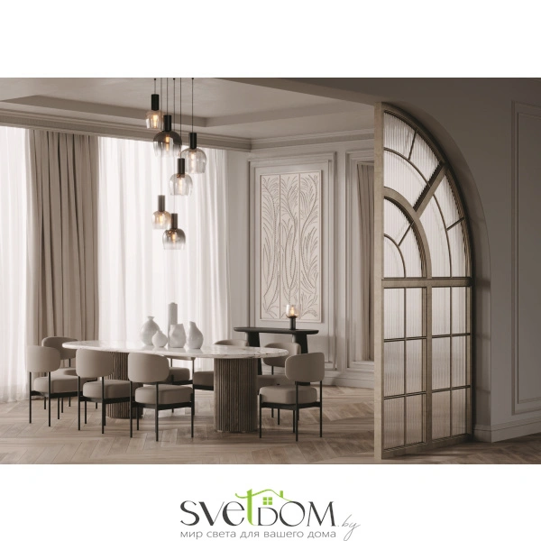 Цветовая гамма: дымчато-серый или насыщенно-янтарный цвет стекла в сочетании с черной или золотой арматурой. В серии есть модели светильников со сменным источником света с цоколем Е27 (каскадная композиция, потолочный и настольные светильники) и LED-источником (одинарные подвесные светильники). Температура свечения LED – 3000 К, угол рассеивания — 120 градусов. Плафоны каскадной композиции плафоны разных размеров и оттенков, установленные на одно основание. Оригинальный декор — актуальный вариант современной классики.
