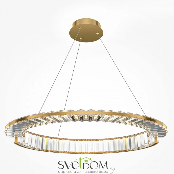 Металлическая арматура в золотом цвете. Асимметричный хрустальный декор. Трендовая форма окружности. LED-источник света с температурой 4000К. Высокий индекс цветопередачи 90Ra.