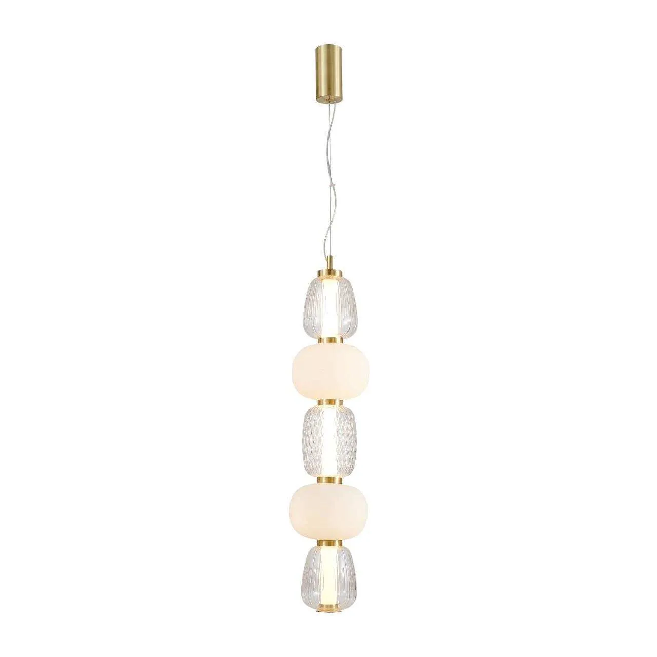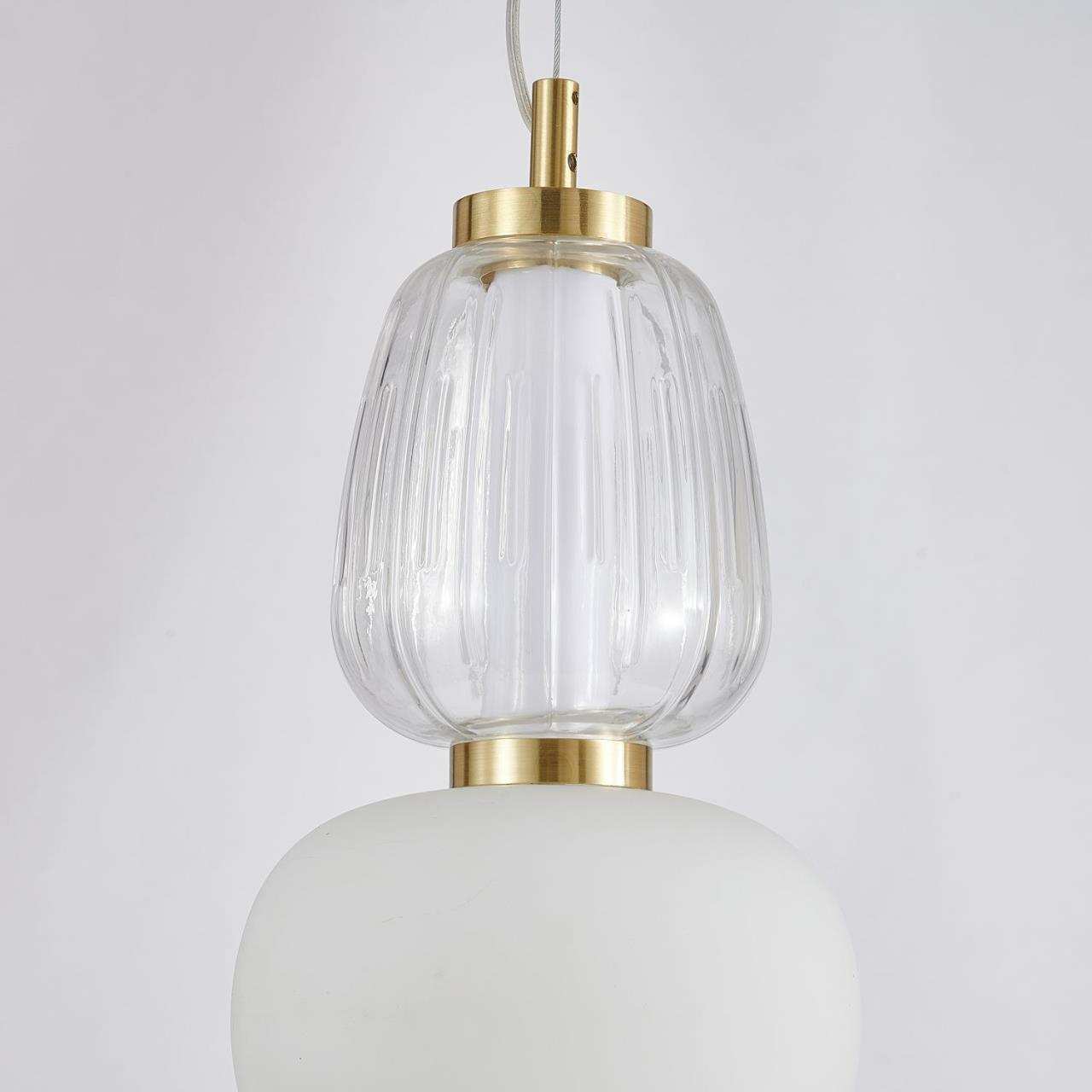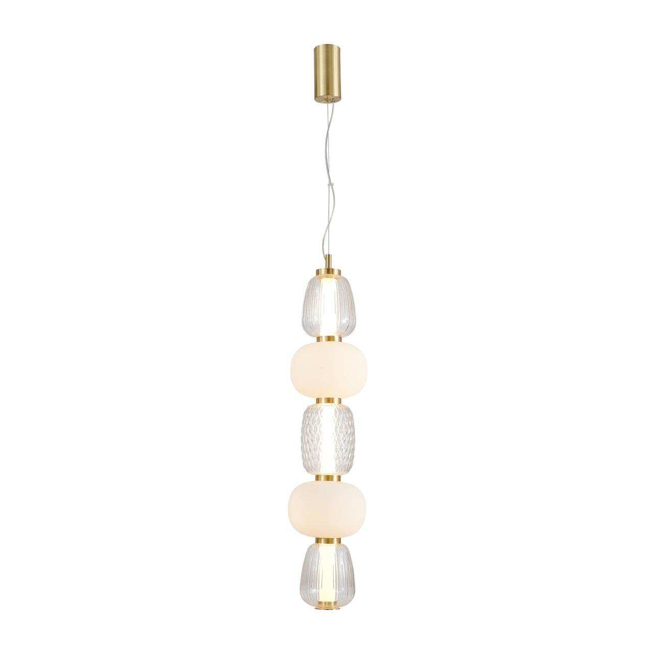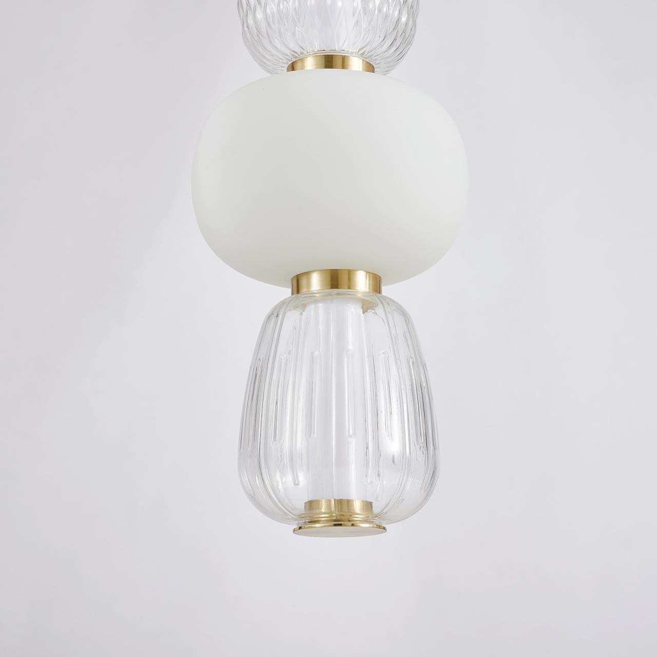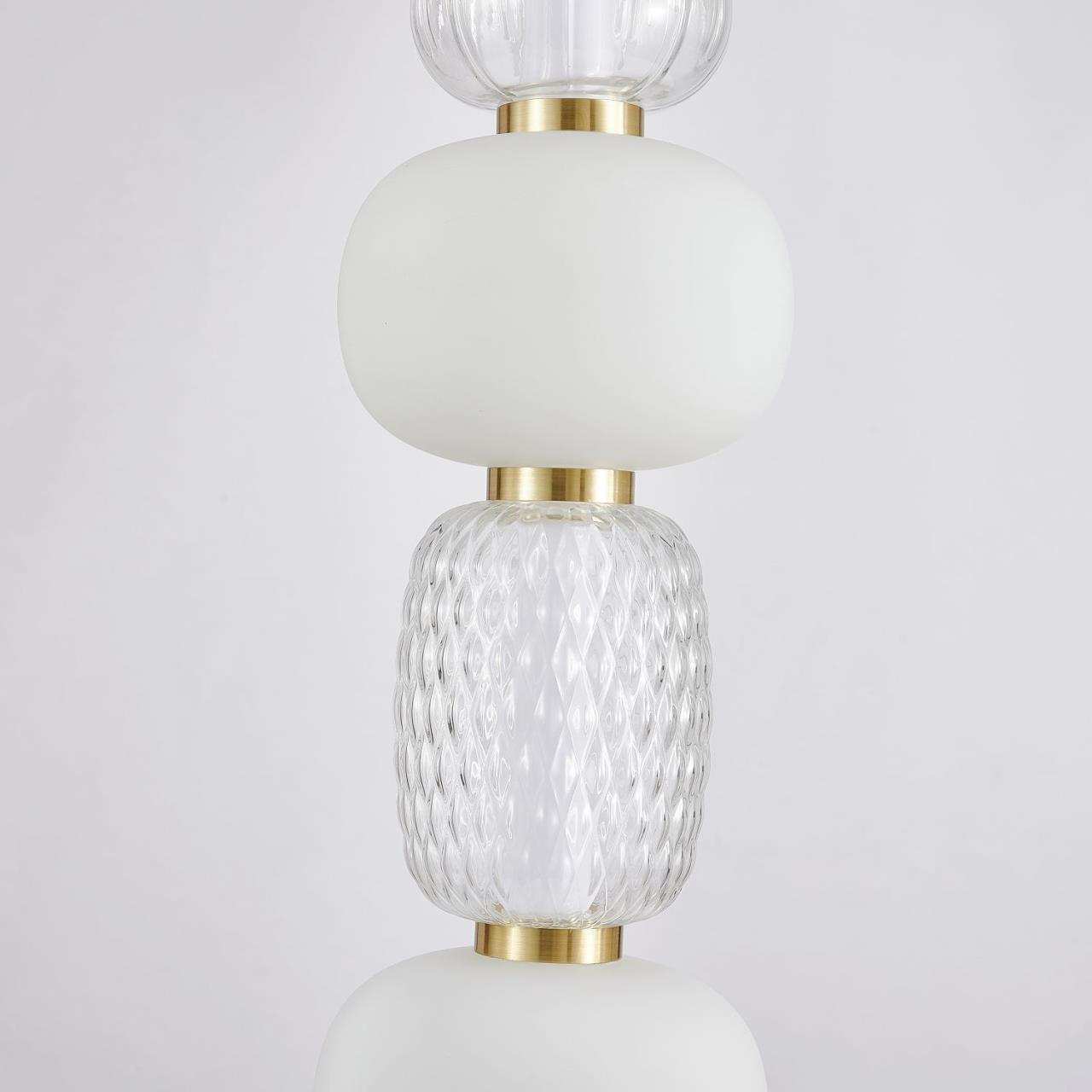 Каркас цвета золота, плафоны в виде бусин разнообразных форм из выдувного стекла двух видов - прозрачного и цвета опала