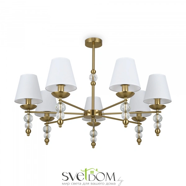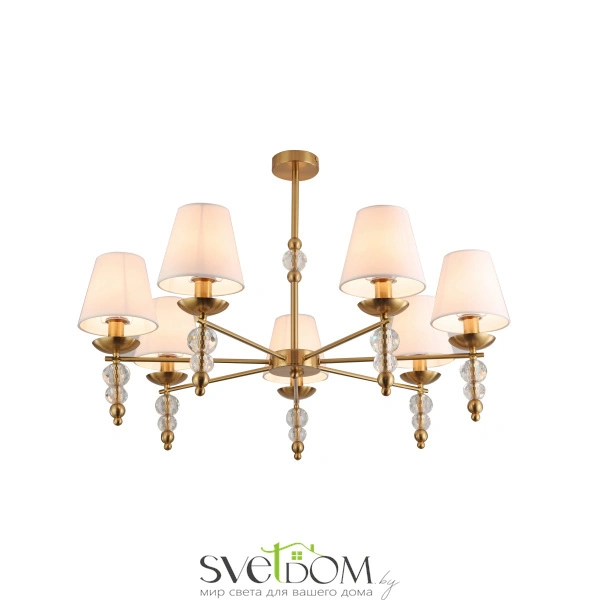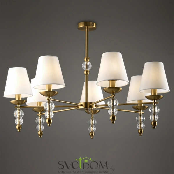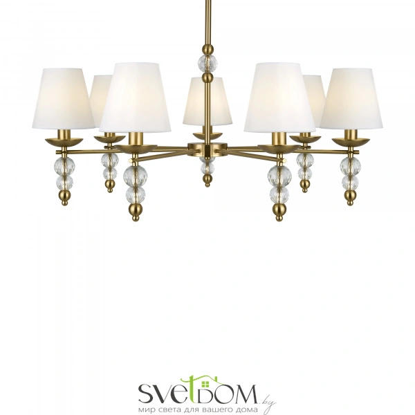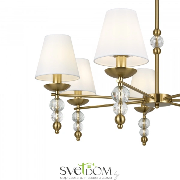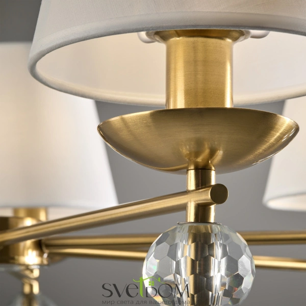 Материал абажура — ткань, цвет — белый. металлическая арматура в цвете латунь обрамлена хрустальными бусинами. источник света — лампы с цоколем е14. степень защиты — ip20.