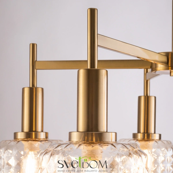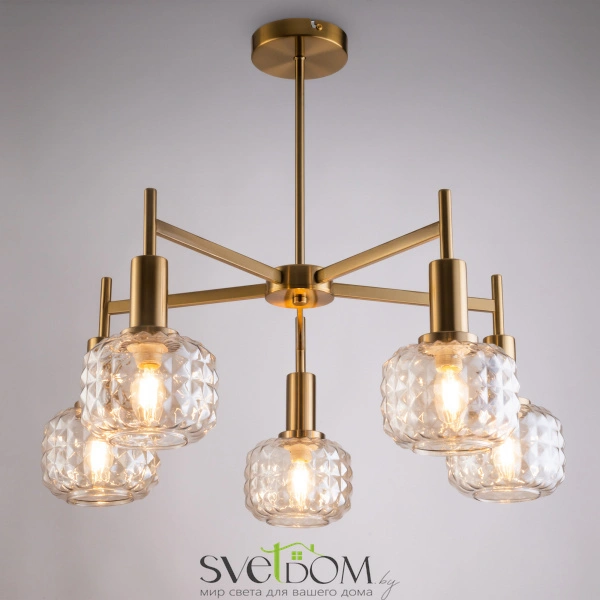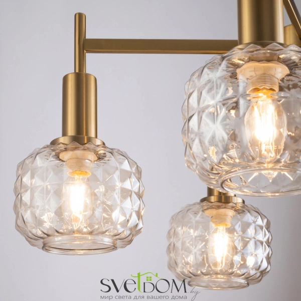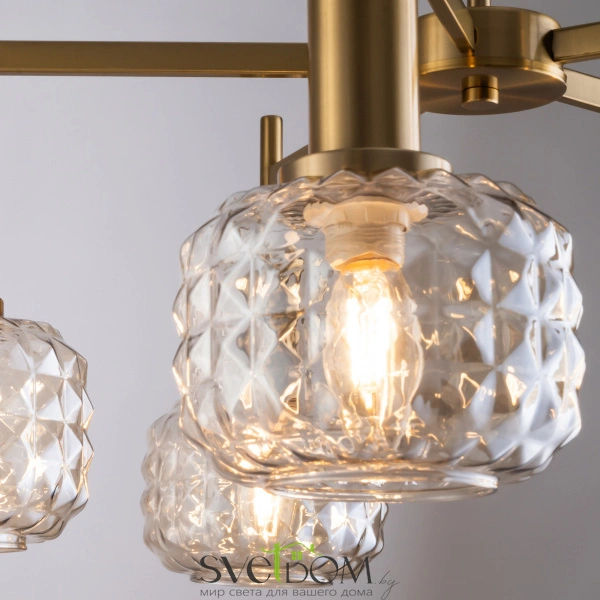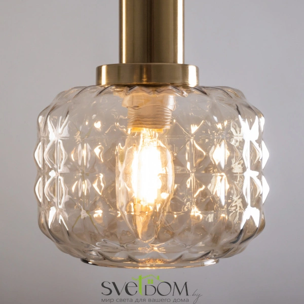 Металлическая арматура в цвете латунь. Плафоны из толстого рельефного стекла в оттенке амбра с «шипованной» огранкой. Подвесные модели регулируется по высоте. Источник света - лампа с цоколем Е14