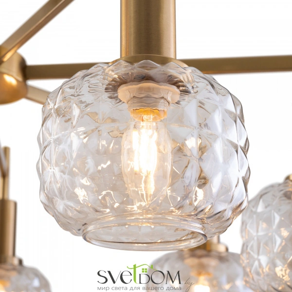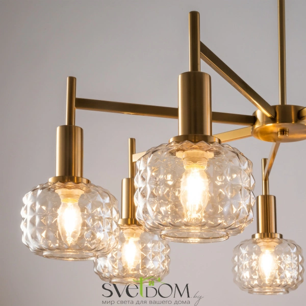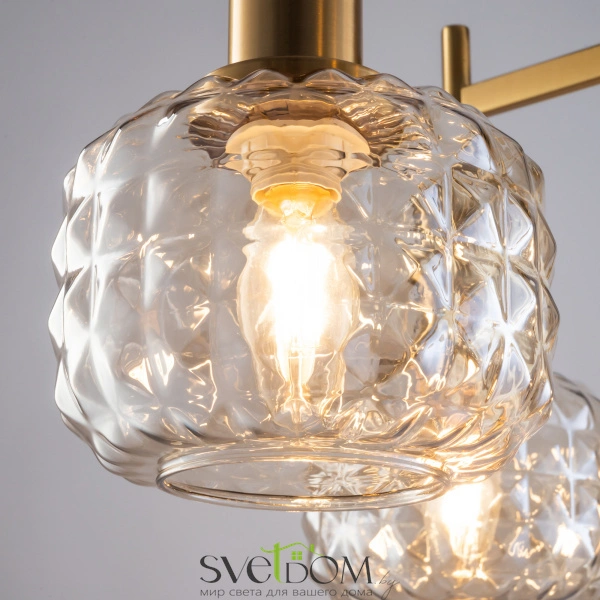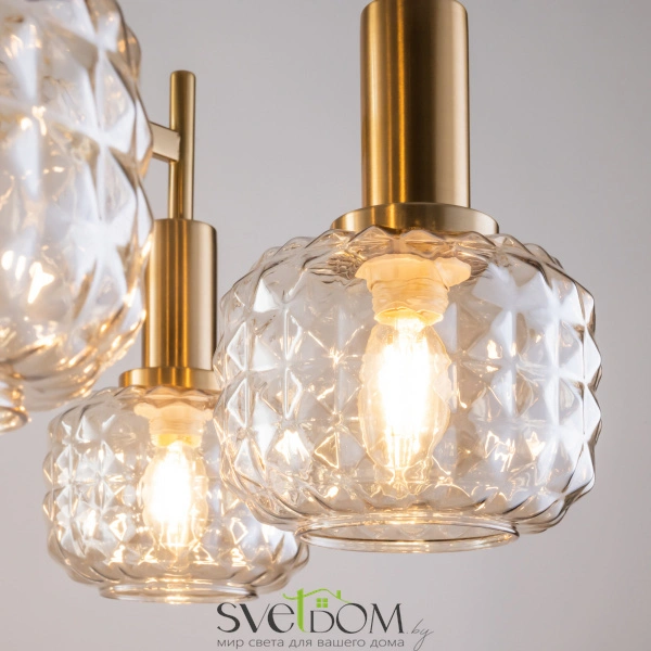 Металлическая арматура в цвете латунь. Плафоны из толстого рельефного стекла в оттенке амбра с «шипованной» огранкой. Подвесные модели регулируется по высоте. Источник света - лампа с цоколем Е14