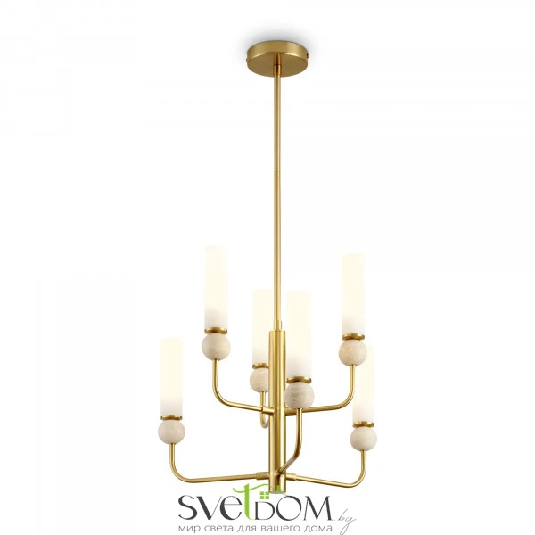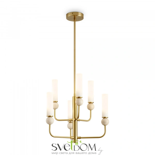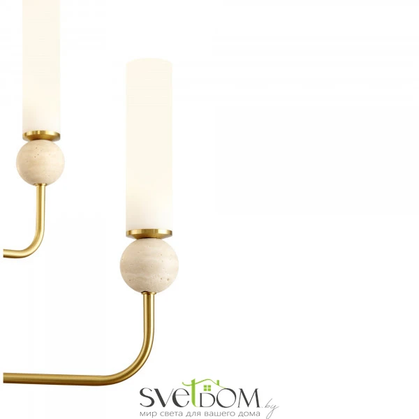 Натуральный травертин и стеклянные плафоны. Металл (латунь, черный). Матовые белые абажуры. LED 3000K (E14/G9, не в комплекте). Сенсорное управление. Подвесные светильники с декоративным элментом травертина в виде шара.