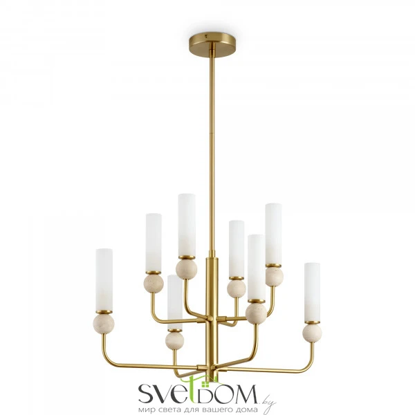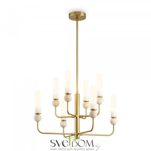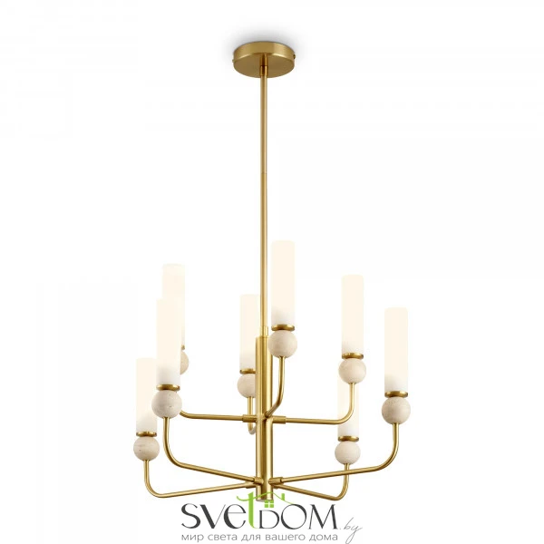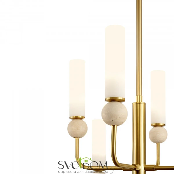 Натуральный травертин и стеклянные плафоны. Металл (латунь, черный). Матовые белые абажуры. LED 3000K (E14/G9, не в комплекте). Сенсорное управление. Подвесные светильники с декоративным элментом травертина в виде шара.