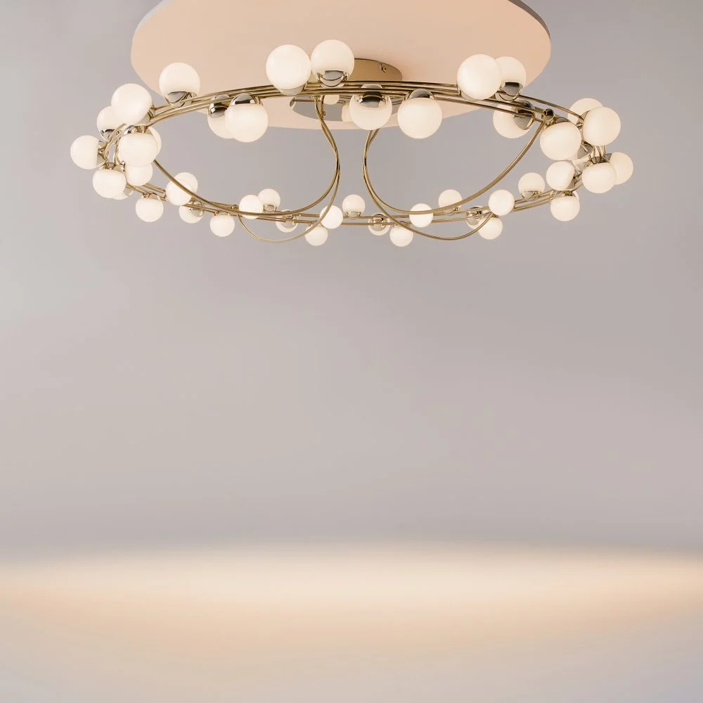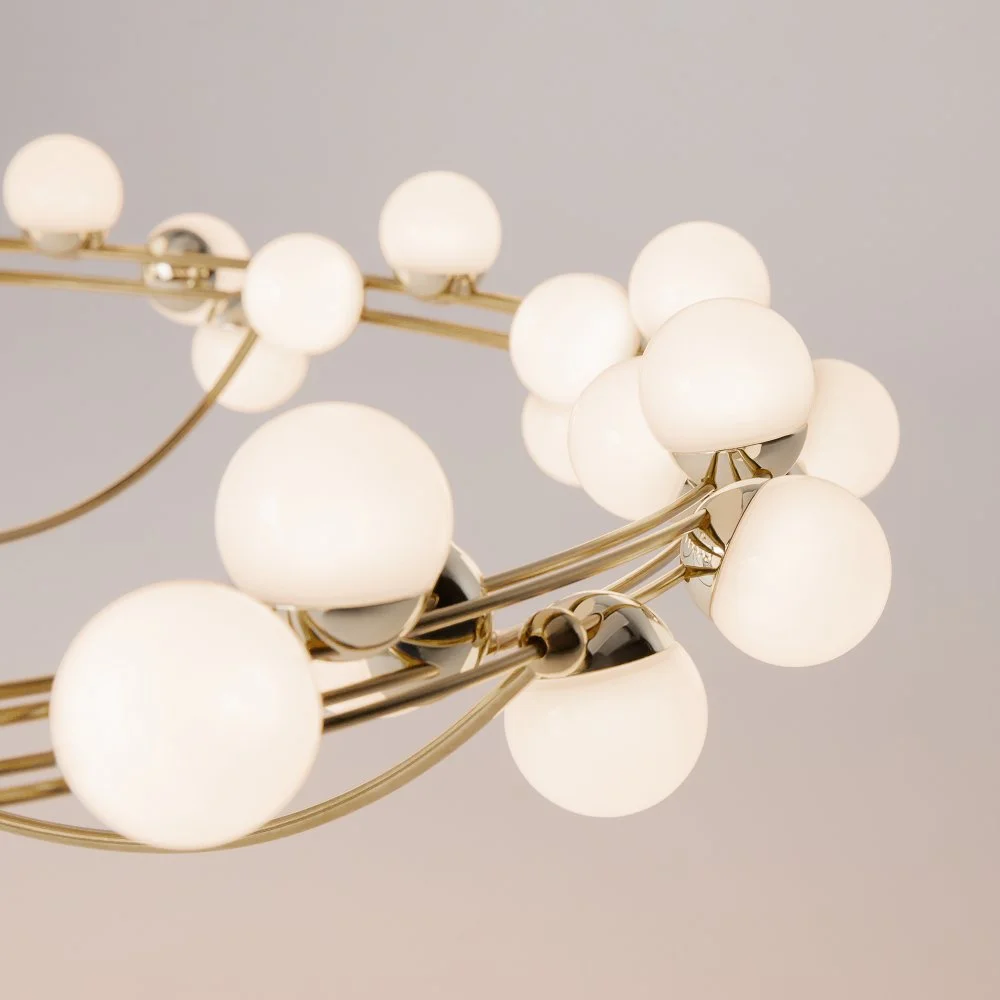 Арматура из металла в золотом цвете. Плафоны-сферы — белый пластик. Дизайн с имитацией молекулярной структуры. LED-источники света.