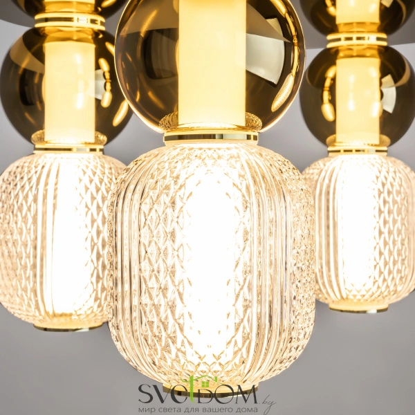 Материал арматуры - металл, цвета - золото, хром. микс плафонов: гладкие cферы коньячного или дымчатого оттенка + округлые рельефные с ромбовидным узором из прозрачного стекла. регулируемая высота подвесных моделей - максимальная длина провода 3 метра. led-источник света, цветовая температура 3000к