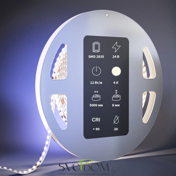 Энергоэффективная светодиодная лента (больше 140-165 Лм/Вт) мощностью 6 Вт/м, 9,6 Вт/м и 12 Вт/м на выбор. Цветовая температура - 2700К, 3000К и 4000К. Плотность светодиодов - 80 шт/м, 128 шт/м и 160 шт/м. Размер - 8х5000 мм. Индекс цветопередачи >90Ra. Угол рассеивания 120°. Рабочее напряжение 24 В. Применяется как для основного освещения, так и для декоративной подсветки интерьера.