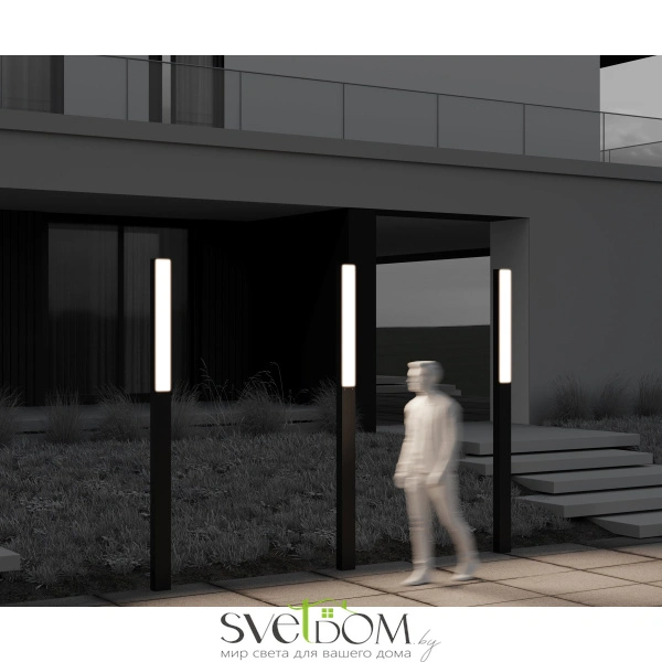 Материал арматуры — алюминий, цвет — графит. Рассеиватель из белого матового акрила — мягко рассеивает свет. Два размера — 1000 мм и 2500 мм. Мощность 20Вт и 40Вт для высокого светильника. LED-источник света. Цветовая температура 3000К. Защита корпуса от пыли и влаги — IP65. Подходят для основного освещения экстерьера.